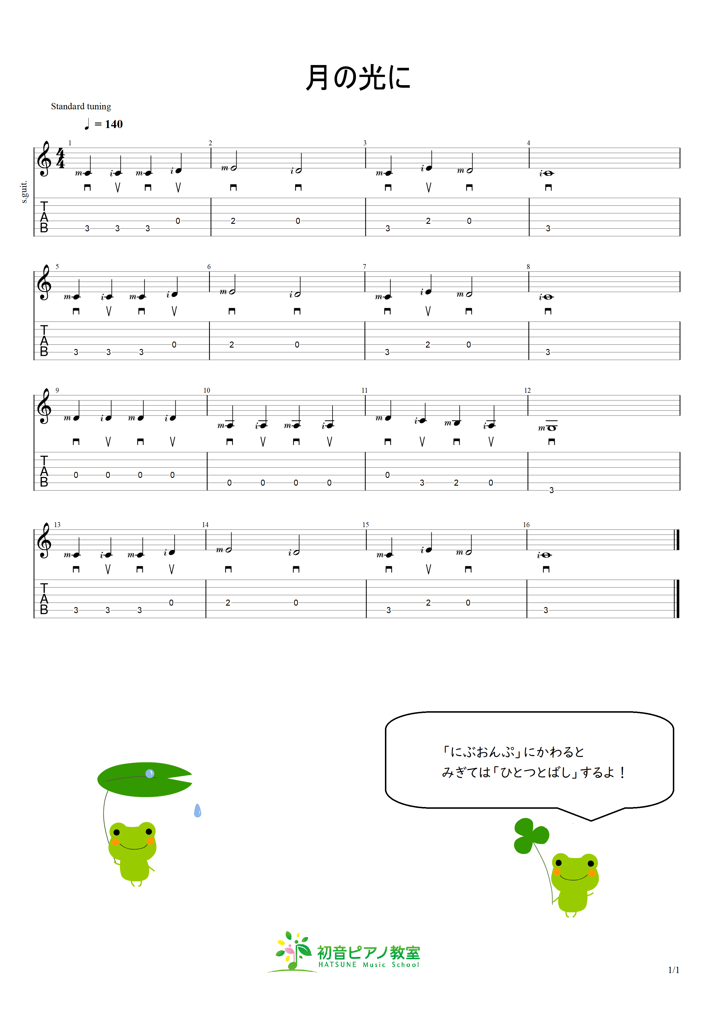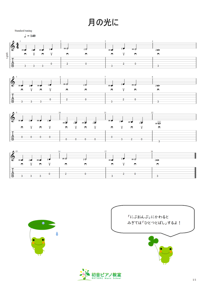 1小節目は拍ごとに弾くのでダウン、アップ、ダウン、アップ。と弾きますが、